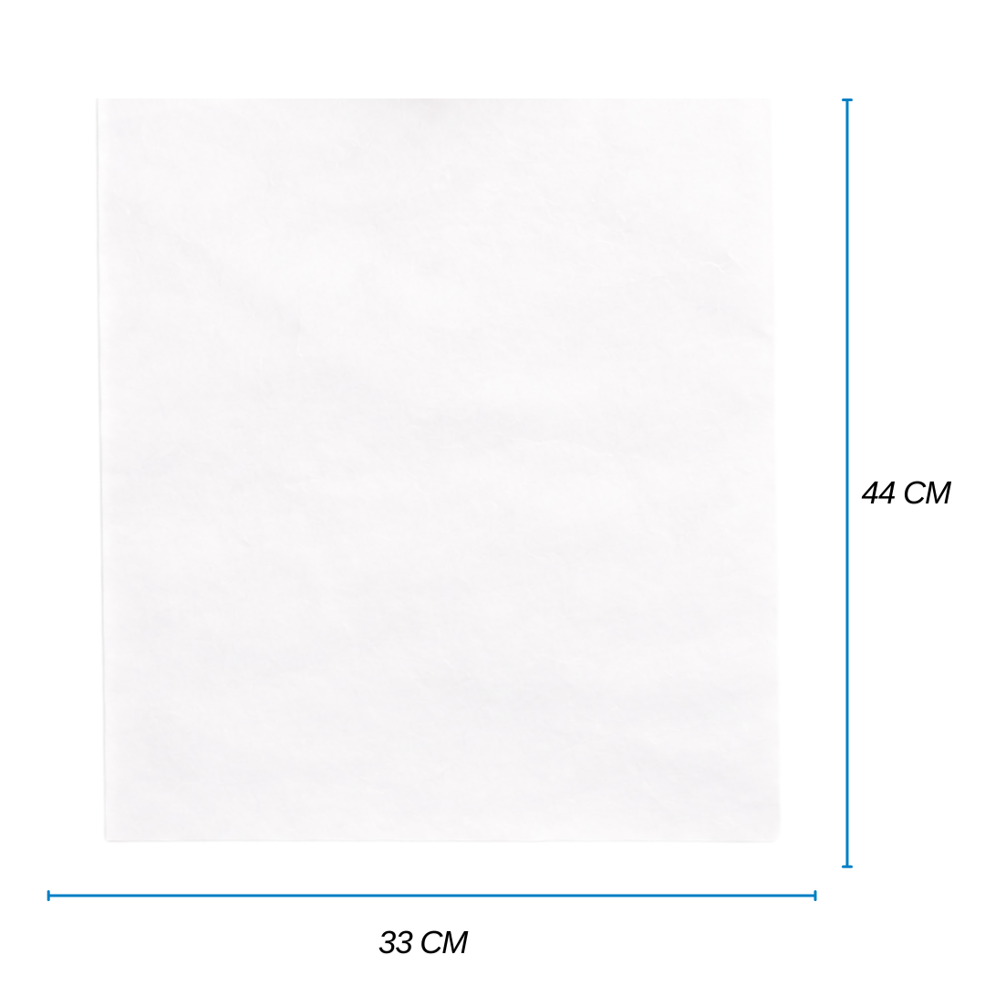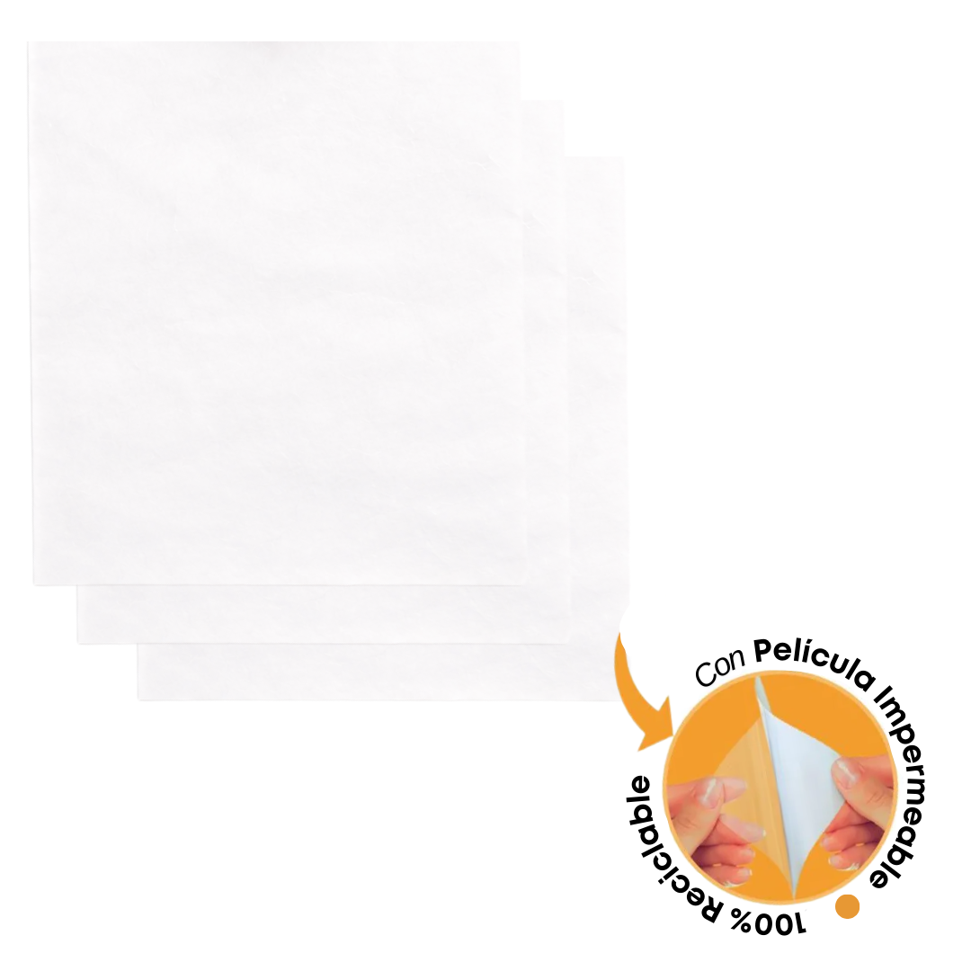 Formato 33 x 44 cm, con doble lámina, que brinda mayor resistencia y mejor barrera contra grasa y humedad. Su acabado blanco aporta una presentación limpia y prolija.