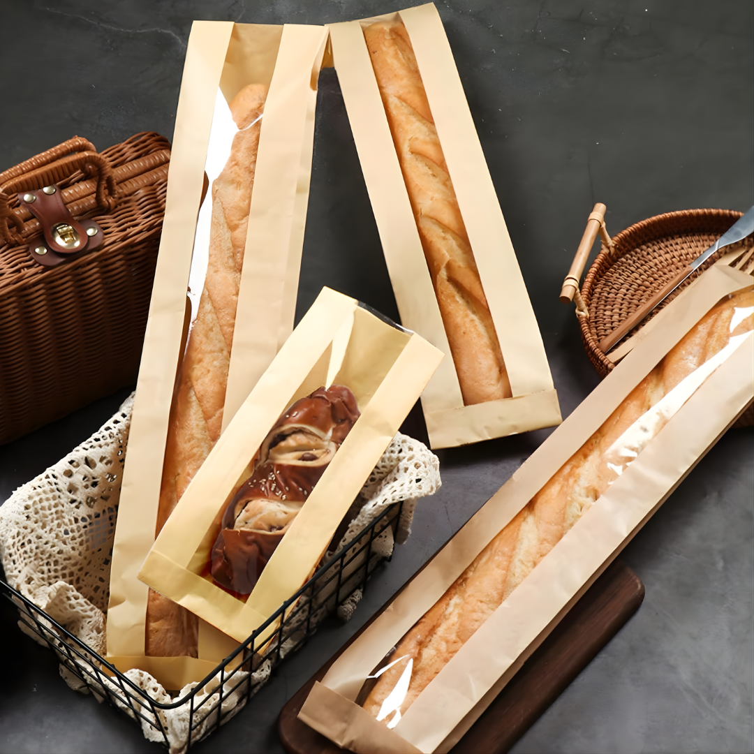 Presentá tus productos de panadería de forma prolija y profesional con nuestras bolsas rectangulares de papel kraft con visor largo y fuelle. Una solución práctica y estética pensada para el uso diario en panaderías y emprendimientos gastronómicos.