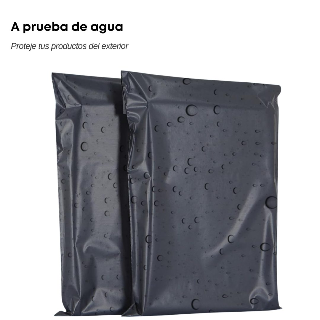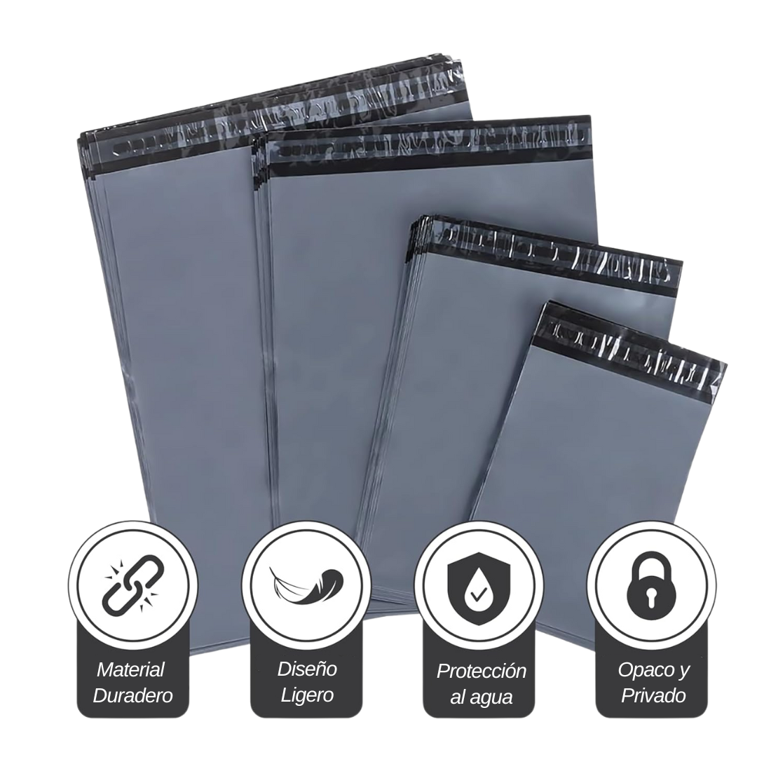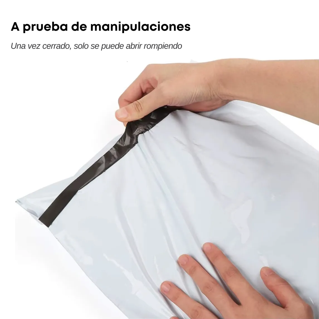 Fabricados en polímero de alta calidad, cuentan con adhesivo inviolable que previene aperturas durante el transporte. Son resistentes al agua, opacos para mayor privacidad y poseen una superficie lisa que facilita la colocación de etiquetas o impresiones.