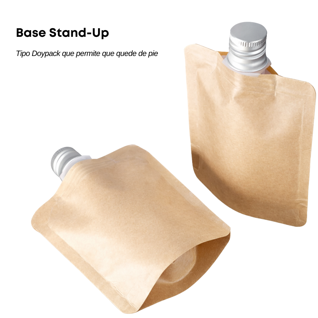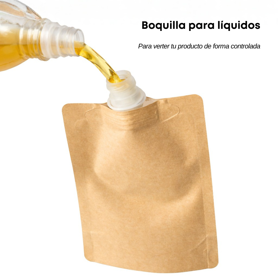 Una solución compacta y práctica para presentar y dosificar líquidos de forma segura y cómoda. La bolsa con boquilla kraft combina estética natural con funcionalidad profesional.