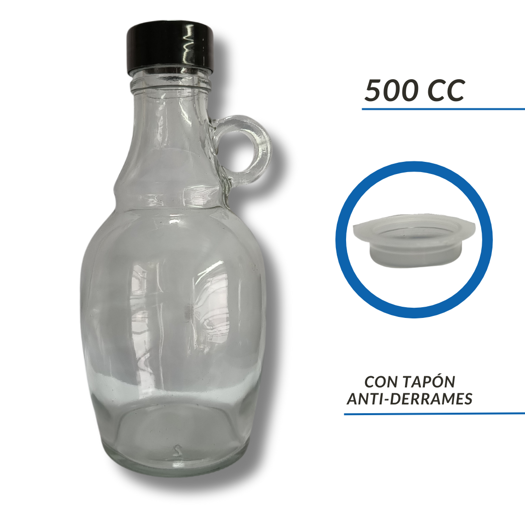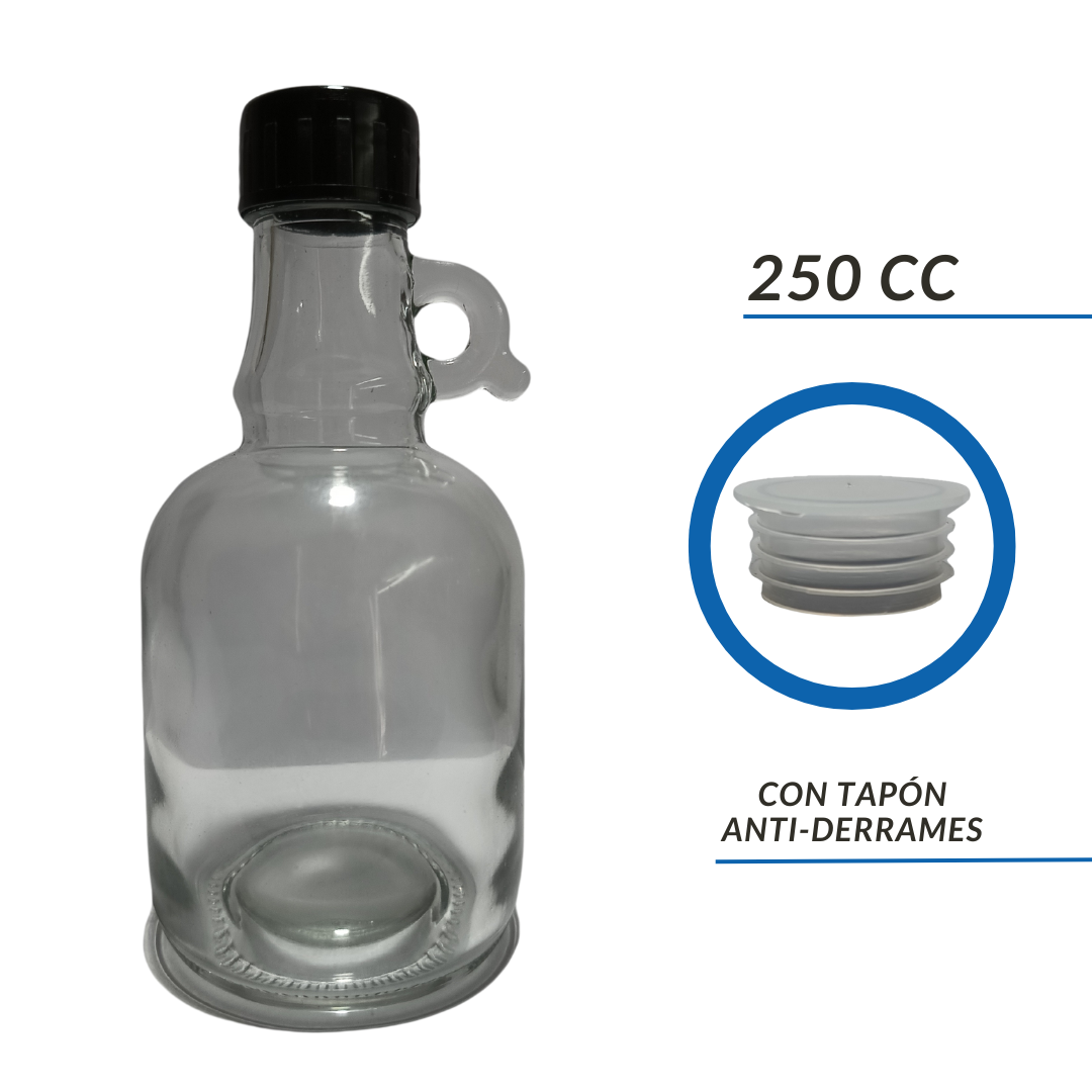 Botella de vidrio Growler de 250cc/500cc con tapa plastica Negra y tapon antiderrame.