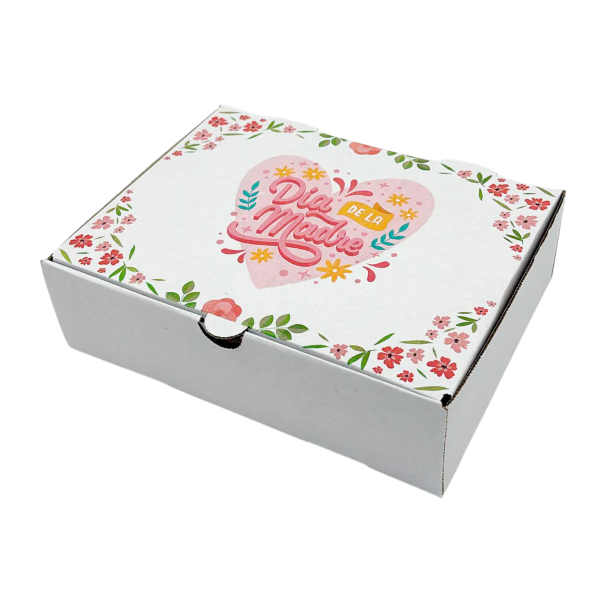 ยกQue tu regalo no pase desapercibido! Esta caja microcorrugada blanca con diseรฑo colorido celebra a mamรก con alegrรญa y mucho estilo.