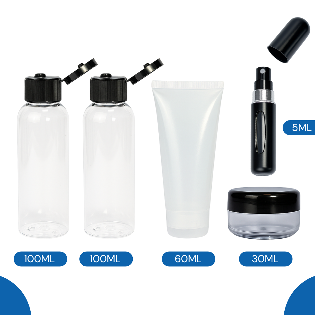 Diseñado para los viajeros más exigentes, este set te permite llevar tus líquidos esenciales sin complicaciones. Los dos frascos de 100 ml con tapa flip-top son perfectos para productos como shampoo o acondicionador, mientras que el pomo de 60 ml y el pote de 30 g son ideales para cremas y lociones. La joya del kit es el decant de perfume de 5 ml, que te permite llevar tu fragancia favorita sin ocupar espacio.
