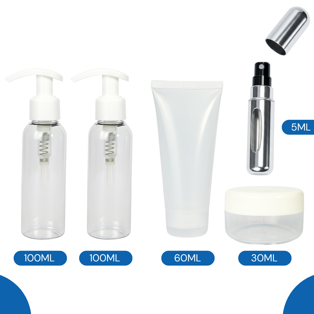 Este set está pensado para los viajeros que no quieren sacrificar su rutina de belleza y cuidado personal. Incluye dos frascos de 100 ml con válvula cremera, ideales para shampoo, acondicionador o lociones corporales. Además, cuenta con un práctico pomo de 60 ml, un pote cosmético de 30 g para tus cremas favoritas y un decant de perfume de 5 ml para llevar tu fragancia preferida. Todos los envases cumplen con las normativas de las aerolíneas, garantizando un viaje sin estrés.