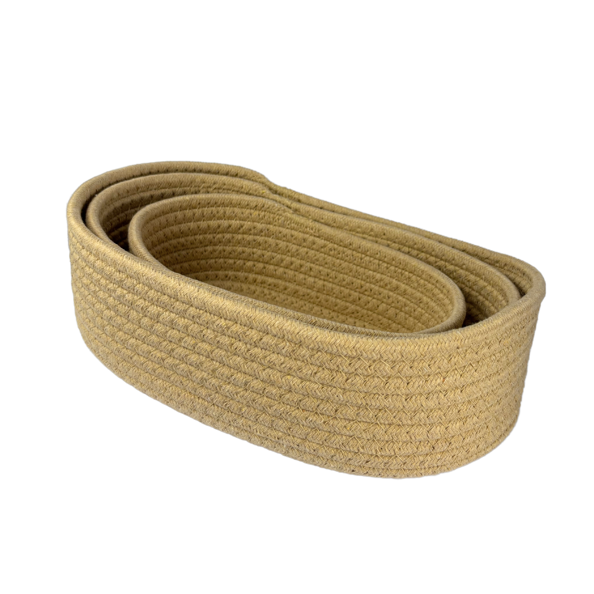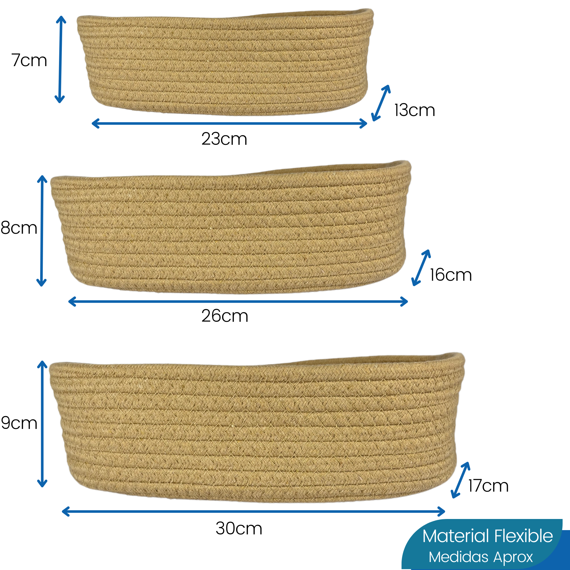 Con un diseño tejido en hilo color marrón y tres tamaños complementarios (30x17x9 cm, 26x16x8 cm y 23x13x7 cm), son ideales para organizar cosméticos, cremas, brochas, perfumes o útiles de oficina como lápices, marcadores y tijeras. Su material flexible permite adaptarse al contenido sin perder su forma cuando están apoyadas, y pueden encastrarse entre sí cuando están vacías para ahorrar espacio.
