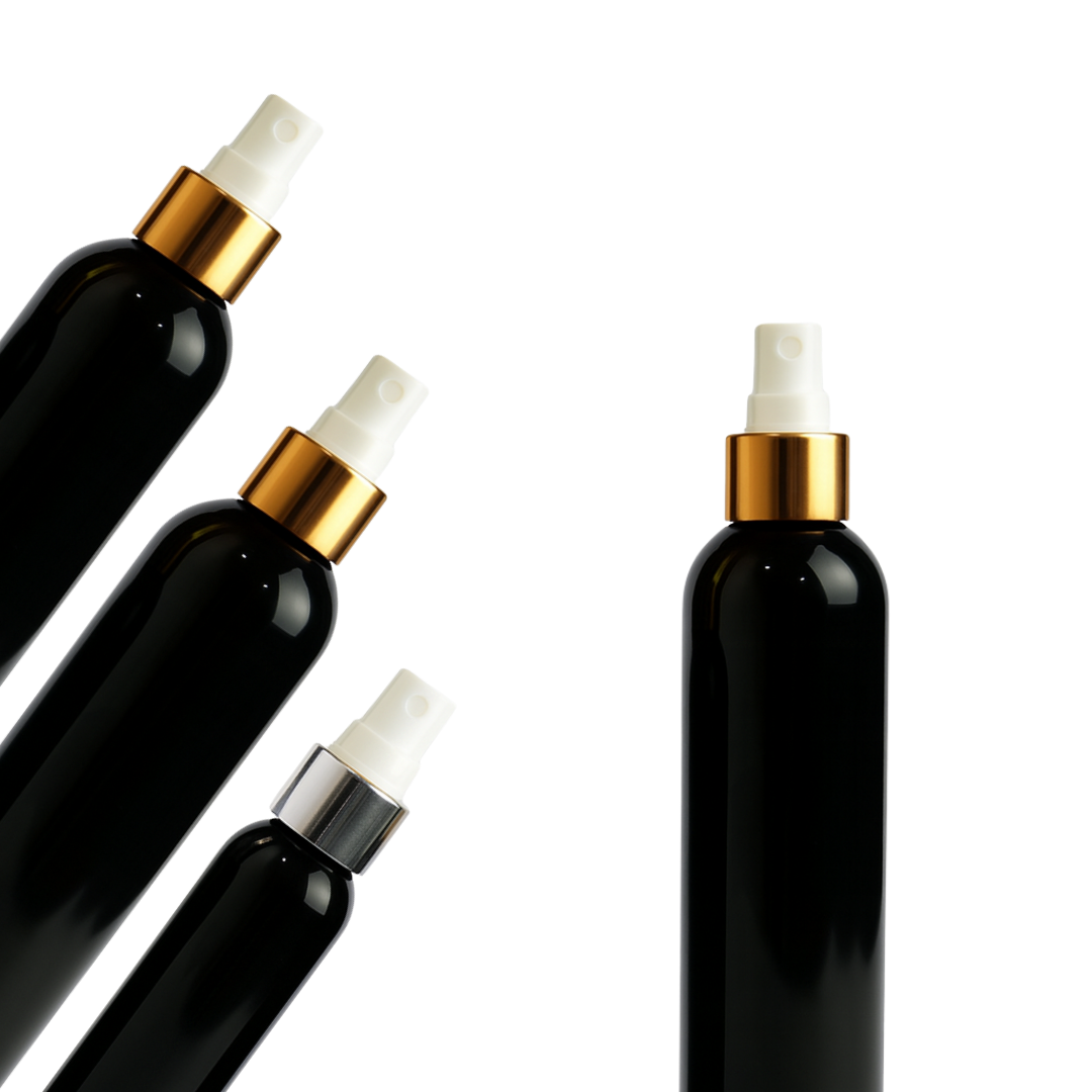 Disponible en 5 capacidades: 30ml, 60ml, 100ml, 120ml y 250ml, con válvula spray en base dorada o plateada, ofreciendo un acabado sofisticado que resalta en cualquier línea de productos.