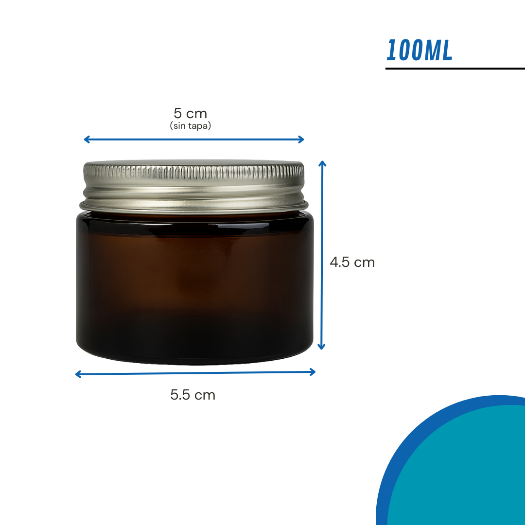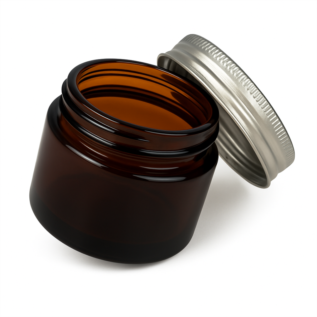 Este pote de vidrio ámbar de 50ml con tapa metálica plateada es ideal para cremas, mascarillas o productos artesanales que necesitan un envase sofisticado y resistente. Diseño premium que protege y realza tu producto.