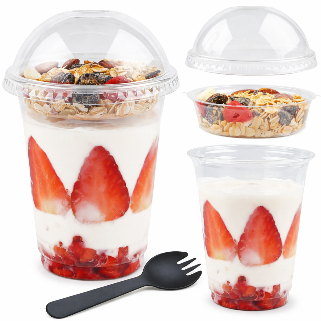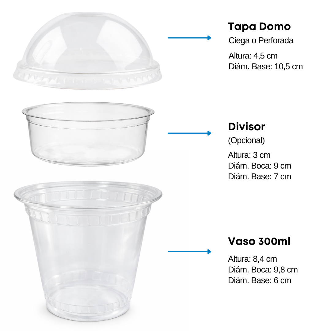 El vaso puede contener yogur, postres, bebidas, mientras que el divisor permite colocar cereales, toppings o frutas, manteniéndolos separados hasta el consumo. El cliente decide cuándo mezclarlos, logrando frescura y mejor textura.