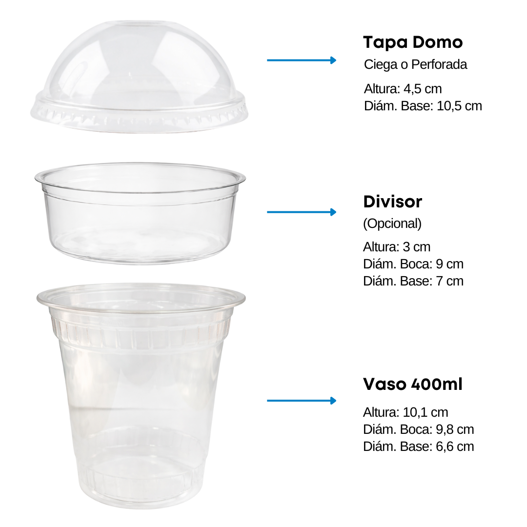 La tapa domo se encuentra disponible en versión ciega o perforada para sorbito, y de forma opcional puede incorporarse un divisor interno, perfecto para separar ingredientes y mezclarlos en el momento de consumir.