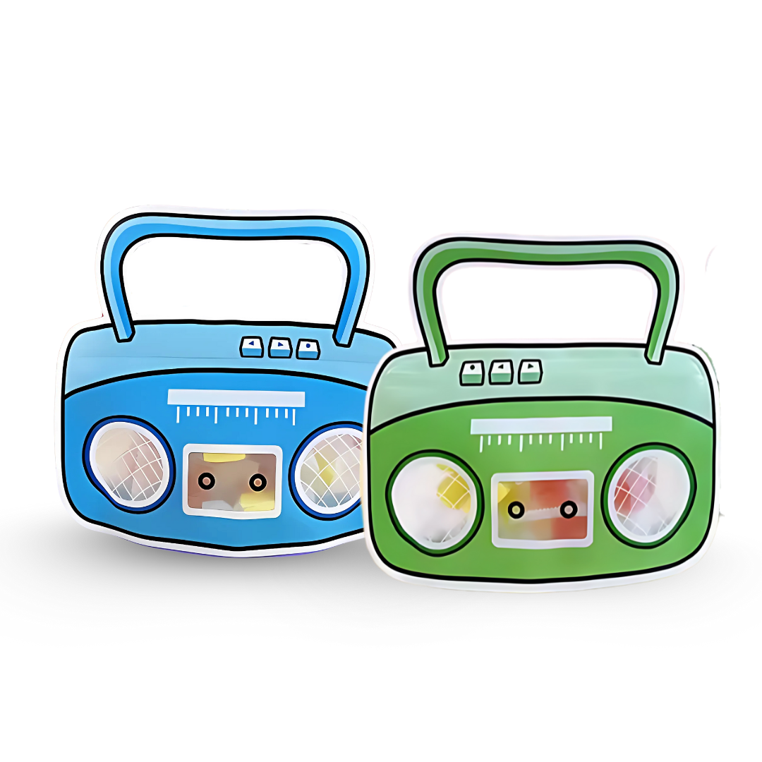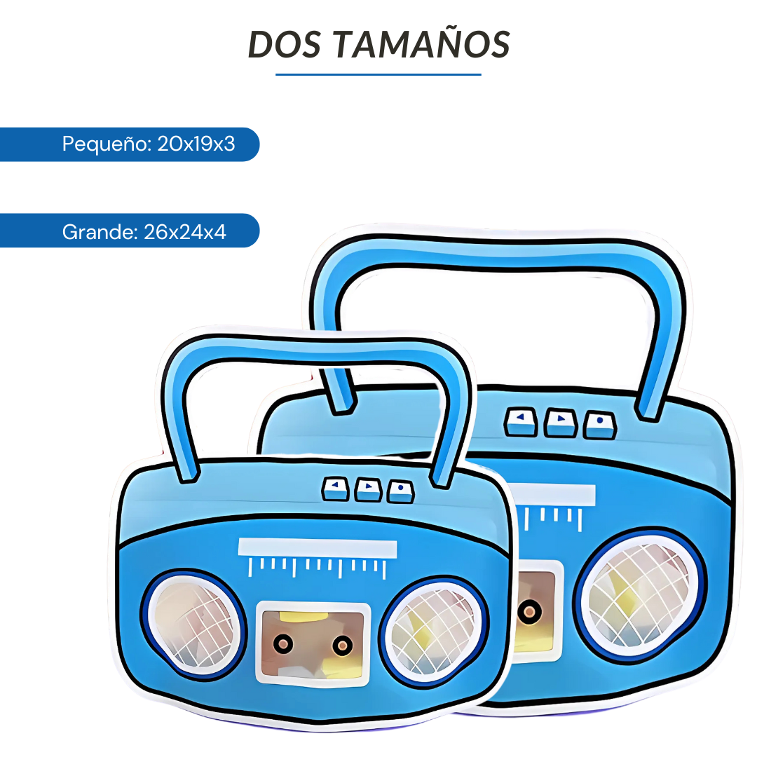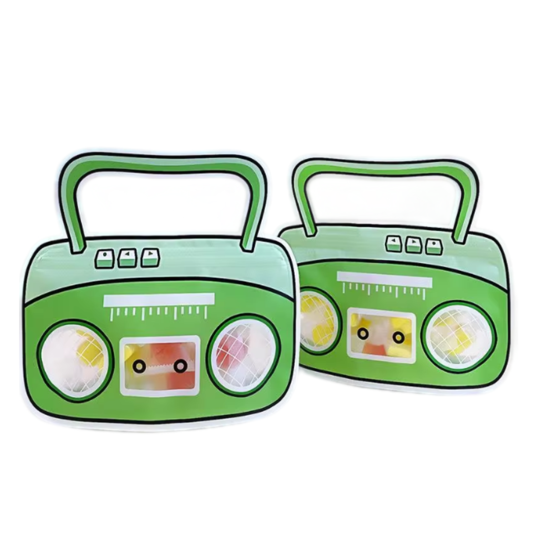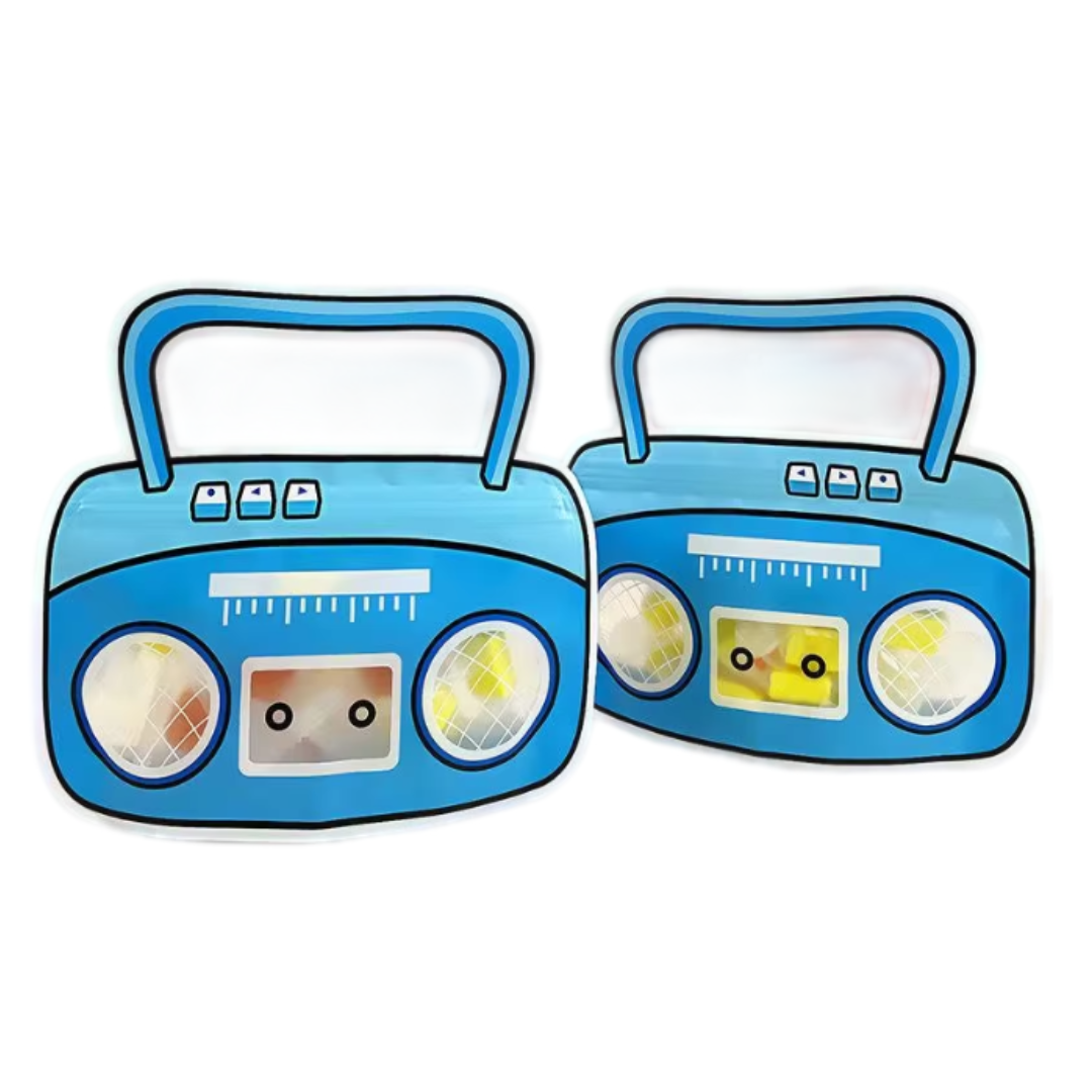 Con diseño de radio retro, nuestras bolsas Ziploc infantiles son ideales para destacar en cualquier tienda, evento o mesa de dulces. Disponibles en dos tamaños (20x19x3 cm y 26x24x4 cm), en colores verde y celeste, incluyen manija superior y una base expandible que les permite mantenerse de pie.