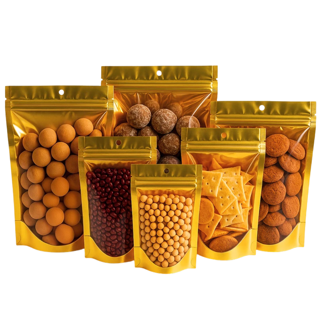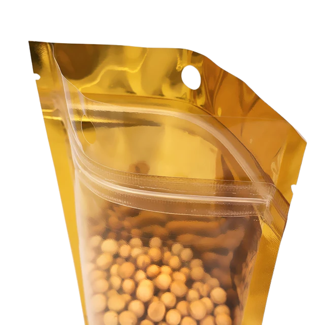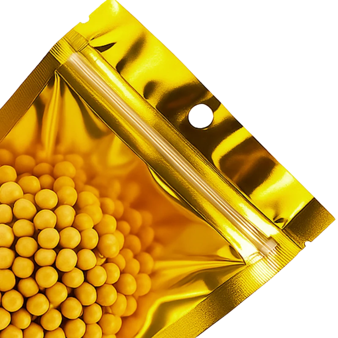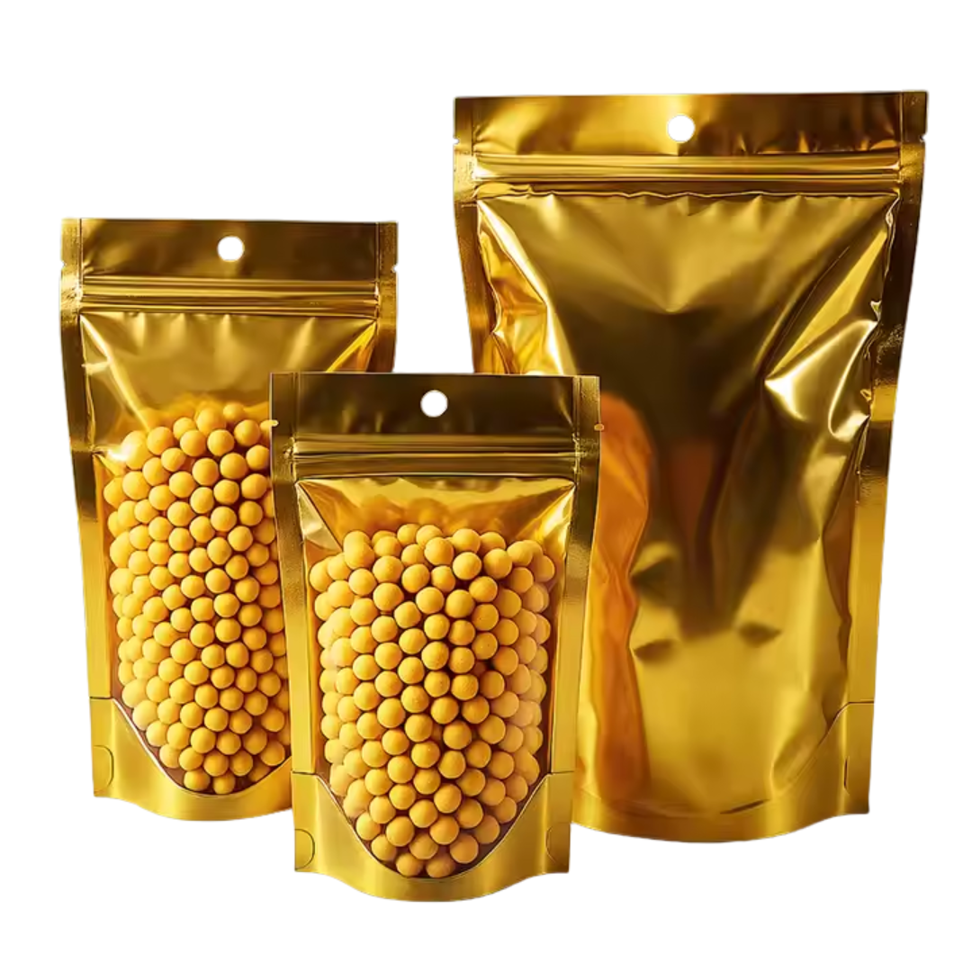 Nuestra bolsa Ziploc aluminio dorada con una cara transparente combina estética premium con funcionalidad. Disponible en tres tamaños (9×14 cm, 14×20 cm y 16×24 cm), cuenta con cierre hermético tipo Ziploc y una cara transparente para visualizar el producto sin abrirla.